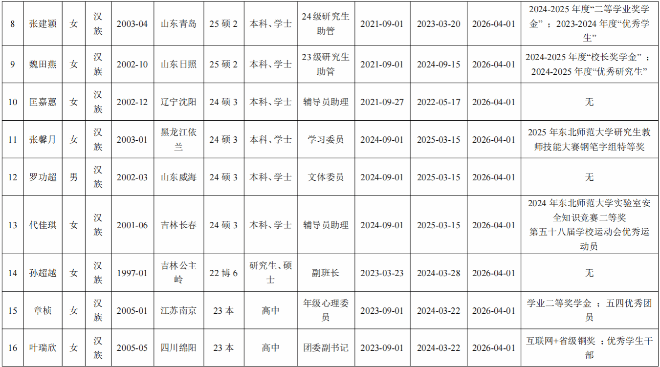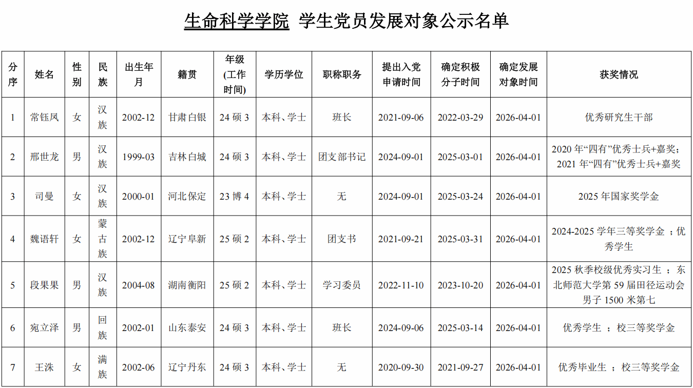 公示期自2026年4月2日起至9日止。对以上青年学生入党如有异议,请具名向学院党委反映,欢迎广大师生对学院发展党员工作进行监督。 联系电话:0431-85099781,电子信箱:zhongsp259@nenu.edu.cn 。